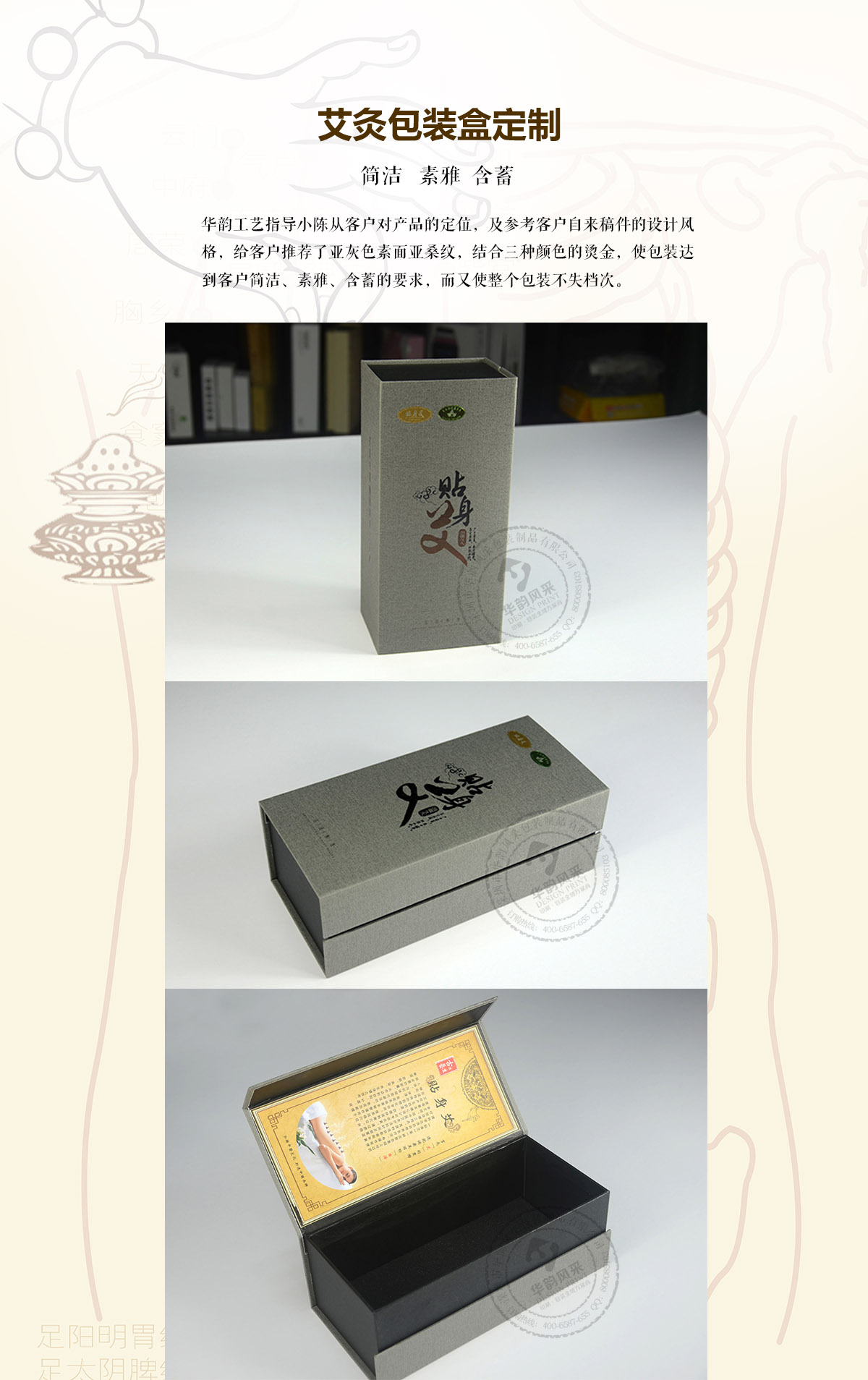簡(jiǎn)潔 素雅 含蓄 華韻工藝指導(dǎo)小陳從客戶對(duì)產(chǎn)品的定位,及參考客戶自來(lái)稿件的設(shè)計(jì)風(fēng)格,給客戶推薦了亞灰色素面 亞桑紋,結(jié)合三種顏色的燙金,使包裝達(dá)到客戶簡(jiǎn)潔、素雅、含蓄的要求,而又使整個(gè)包裝不失檔次。
